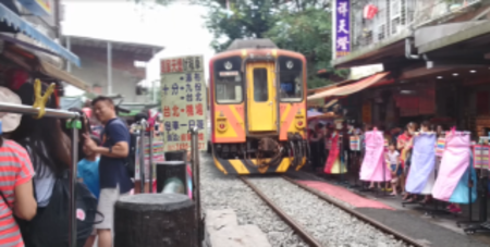 線の『平渓線(ピンシーシエン)』の終点で、お店や人の横を電車がすれすれに通るという