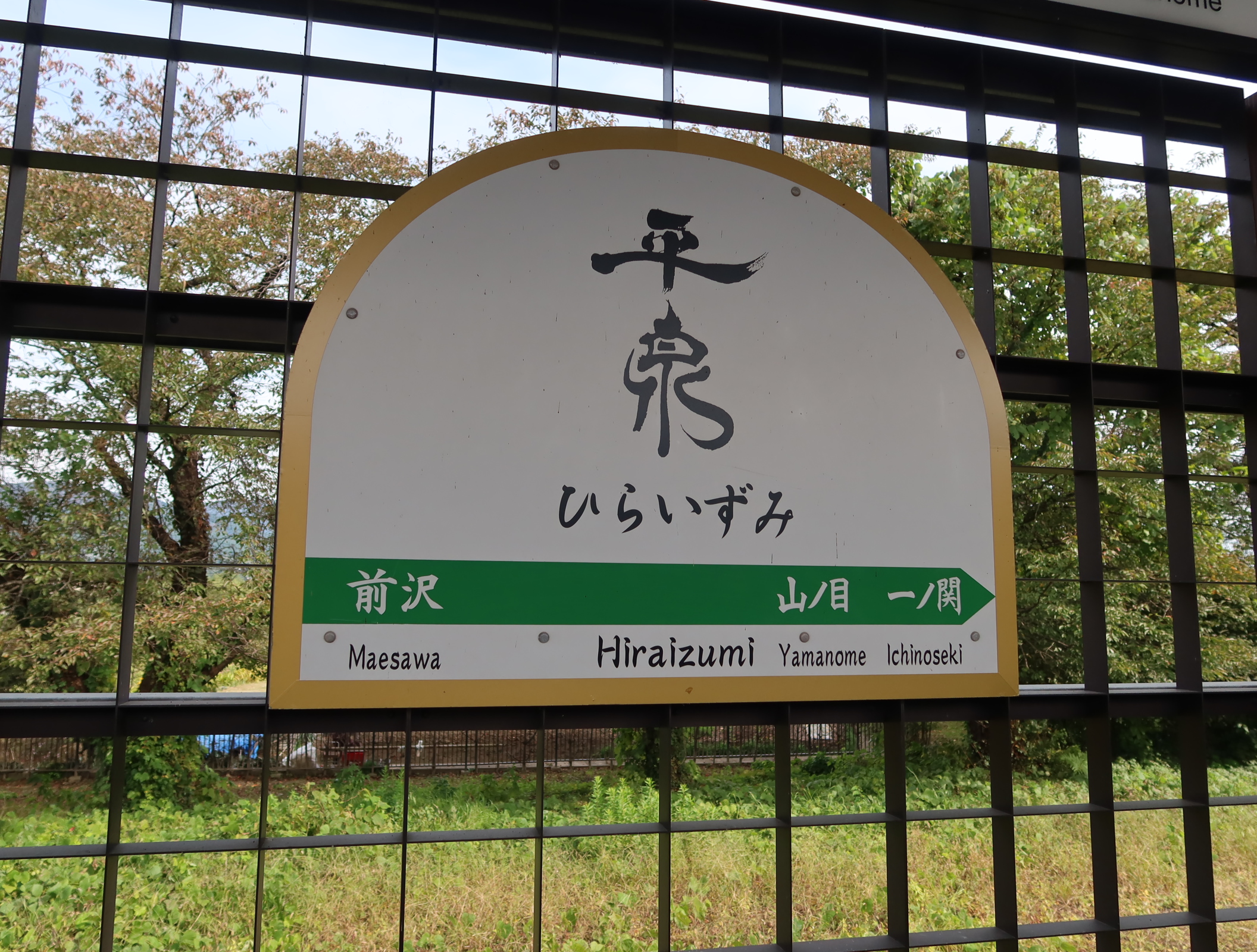 図3は平泉駅プラットホームの駅名表示であり、多くの中尊寺への参拝客が利用していた。 |