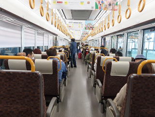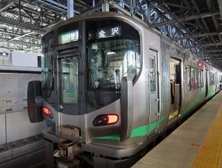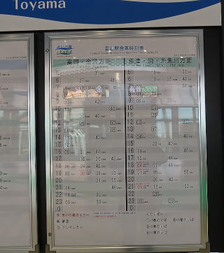 車両は、JR西日本の521系電車が使用されている。JR西日本が新製投入した初の交直流近郊形電車である。図2が車内の様子である。図3が富山駅における時刻表で、かなり頻繁に運行されていることが分かる。 |