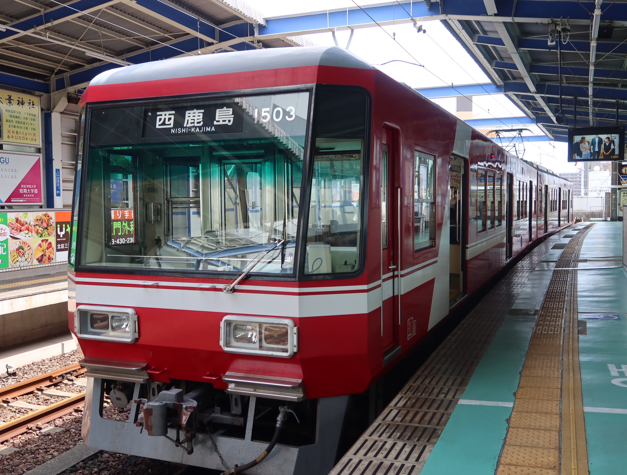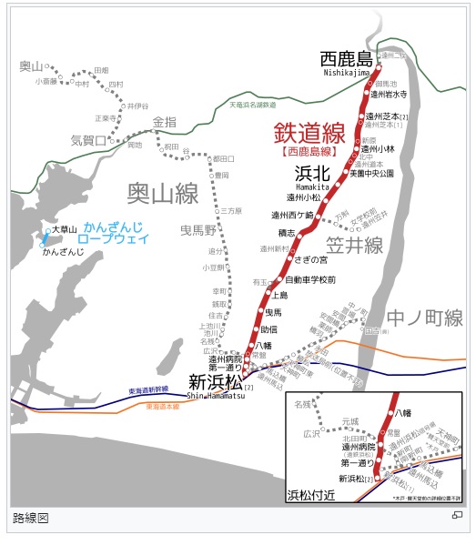 | 遠州鉄道は、静岡県浜松市中区の新浜松駅と、同市天竜区の西鹿島駅を結び浜松市を南北に結ぶ鉄道路線である。赤い電車が走ることから「赤電」とも呼ばれているとのことである(図1)。エバンゲリオンのモデル地として、駅名をシン・ハママツとしたとの装飾があった。図2が車内の様子でロングシートとなっている。図3がシン・ハママツと明記した駅名の看板、図4は遠州鉄道の路線図であり、かっては奥山線も運行していたが、1964年に廃止されたとのことである。なお地方の中小私鉄においては大手私鉄より譲り受けた車両によって車両近代化を実施する例が多く見受けられるが、旅客用車両は電化開業当時から最新の2000形に至るまで、自社発注のオリジナル車両で占められているとのことである。 |