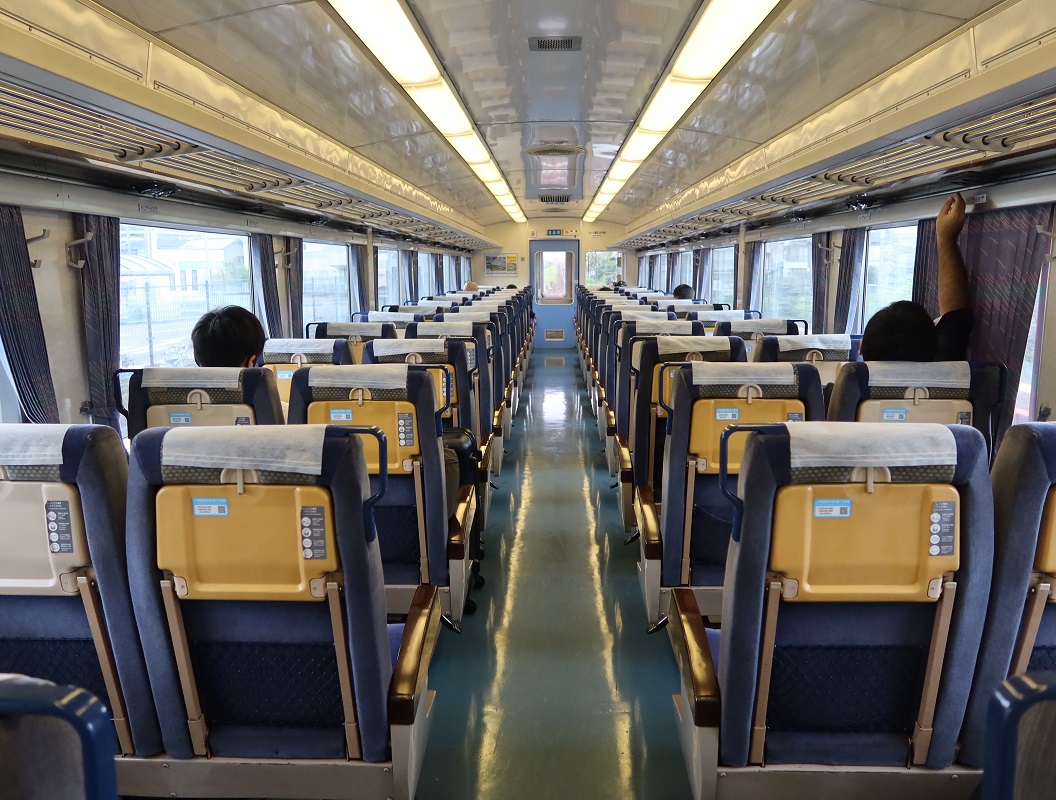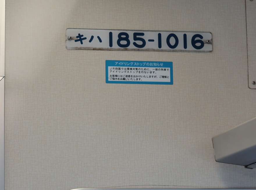 牟岐線には特急「むろと」がある。かっては、徳島駅から牟岐駅間を中心に上下5本が運行されていたが、2019年の改正におり朝の上下1本と夜の下り1本に大幅減便されている。これが朝1本の電光掲示板である。これが朝1本の特急「むろと」の車内の様子であるが、閑散としており、やがて廃止となるか心配である。現在使用されている車両は「キハ185」系気動車である(図1)。図2は車内の様子、図3はキハ車両である銘鈑