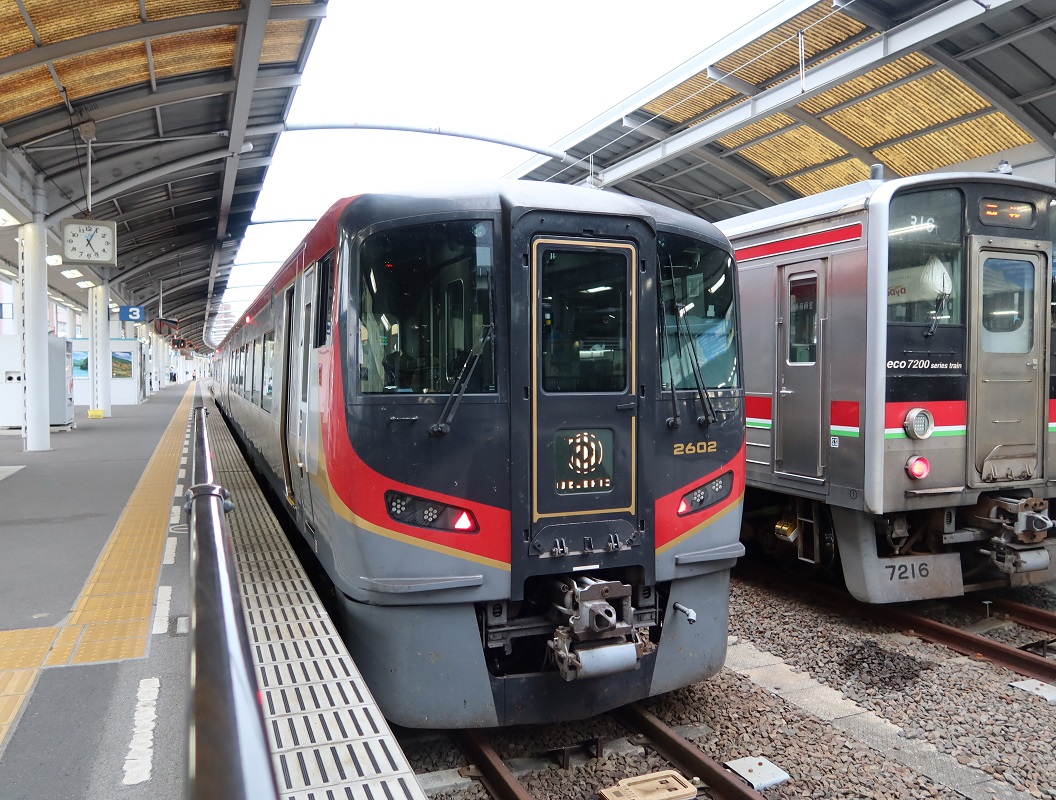 この映像映像は、2700系が高松駅を出発する様子である。現在、2600系と2700系特急気動車が使用されている。2600系は、平成29年8月に臨時列車として高松~徳島間でデビューし、12月から特急うずしおとして、本格的に営業運転を開始しました。最高速度は120km/hで、8600系と同じく、空気バネ式車体傾斜機構を採用しています。”Neo Japonisme(ネオジャポニスム)” をコンセプトに、日本の伝統意匠を現代風にアレンジしたデザインで、安らぎと先進性をあわせ持たせた特急車両となっていいます。図1が2600系気動車です。