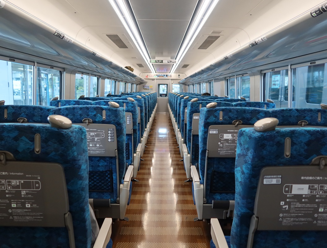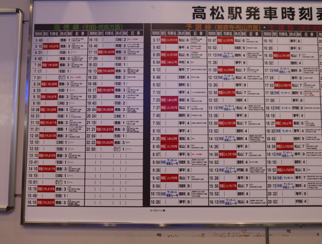 なお、岡山駅発着の2往復は、2001年3月3日からは宇多津駅 - 岡山駅間で「南風」と併結して運転されているが、線形の関係上、高松駅と宇多津駅で列車の進行方向が変わる。これらは現在では日本で定期運行を行う特急列車としては珍しく二回方向転換する列車とのことである。これがいずしお号と南風号の連結のシーンである。現在、うずしお号には 2700系新型特急列車 (2両編成)も運行されている。2019年に登場した新型特急気動車2700系は、全席コンセントを設置し、無料Wi-Fiも完備。さらに、多機能トイレにはおむつ交換台やベビーキープを備えており、現在使用している2000系に比べてさらに快適な車内となっている。図2が車内の様子である。図3は高松駅の時刻表であり、多数の特急列車が運行されている様子が分かる。 |