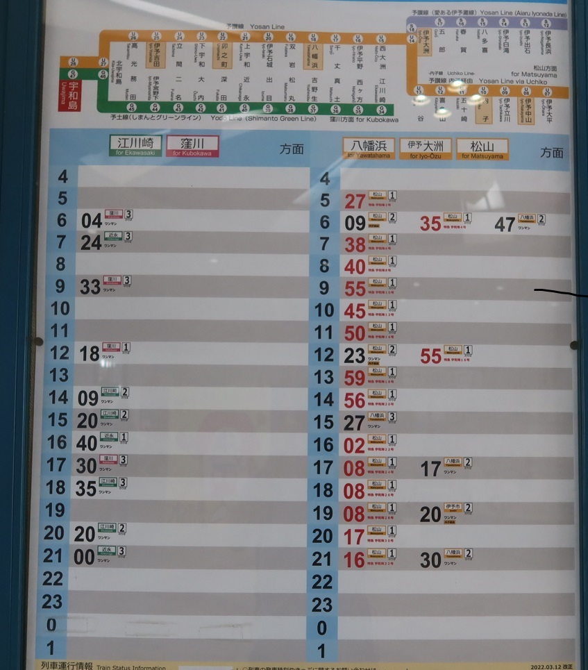 図2が予土線と予讃線の宇和島駅の時刻表である。窪川行きは日に4本のようである。
