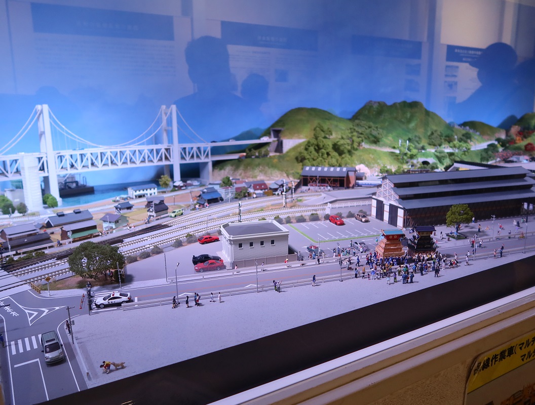 ここのジオラマは、JR伊予西条駅周辺を中心に、四国4県の特徴ある沿線風景を再現した鉄道レイアウトとなっている。以下は、ここ伊予西条駅の再現した情景であり、祭りの風景を再現している(図1)。
