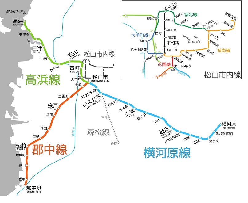 伊予鉄道には、大型の電車を使用する郊外電車と路面を走行する松山市内線がある(図1)。