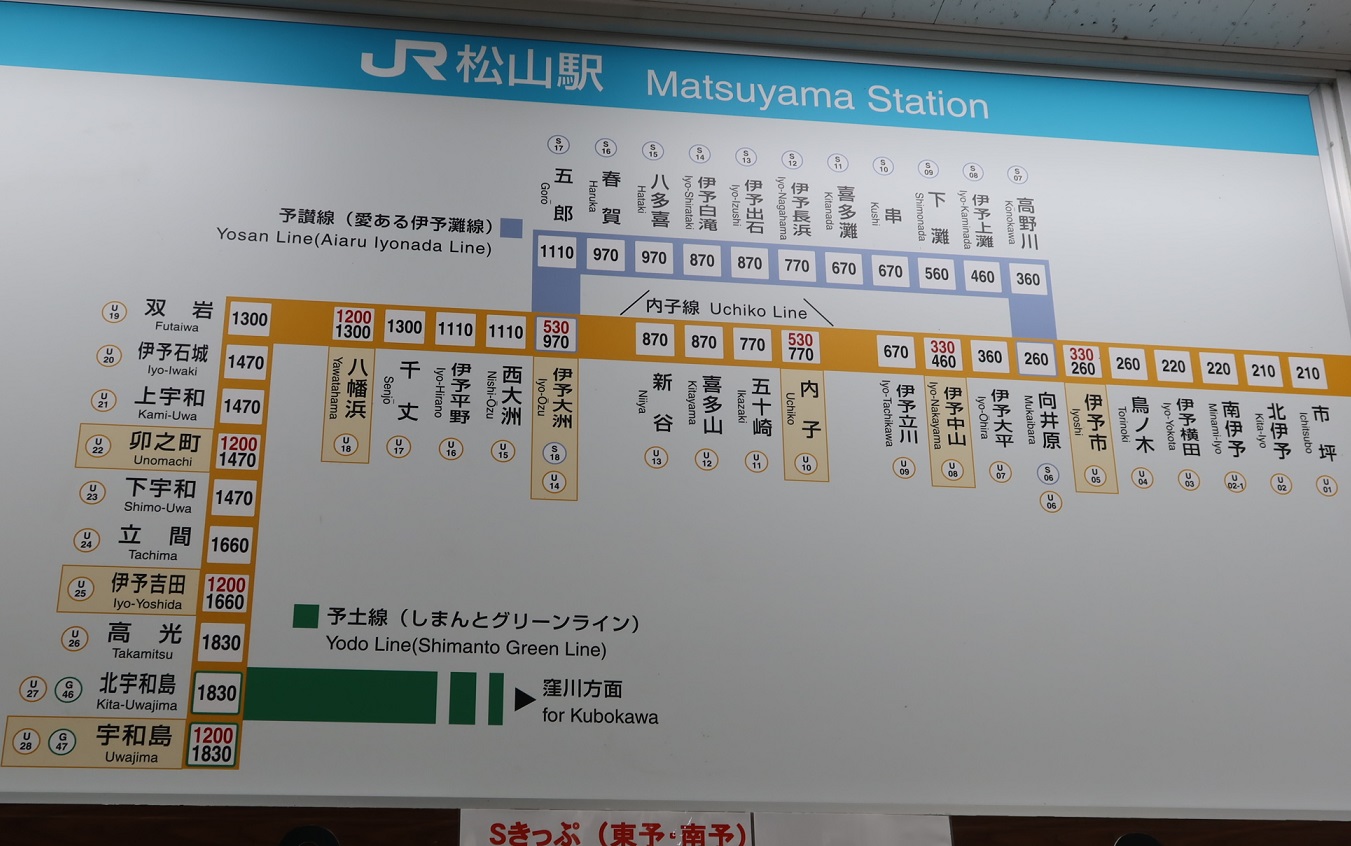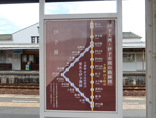 図2が松山駅に表示されていた予讃線の路線図である。特急などは内子線を経由して時間短縮を実現している。なお、人気の観光列車「伊予灘ものがたり」の運行開始にともない、この観光列車が風光明媚な海岸線を通過することから、この祖先を「あいある伊予灘線」とよぶようになったようである。