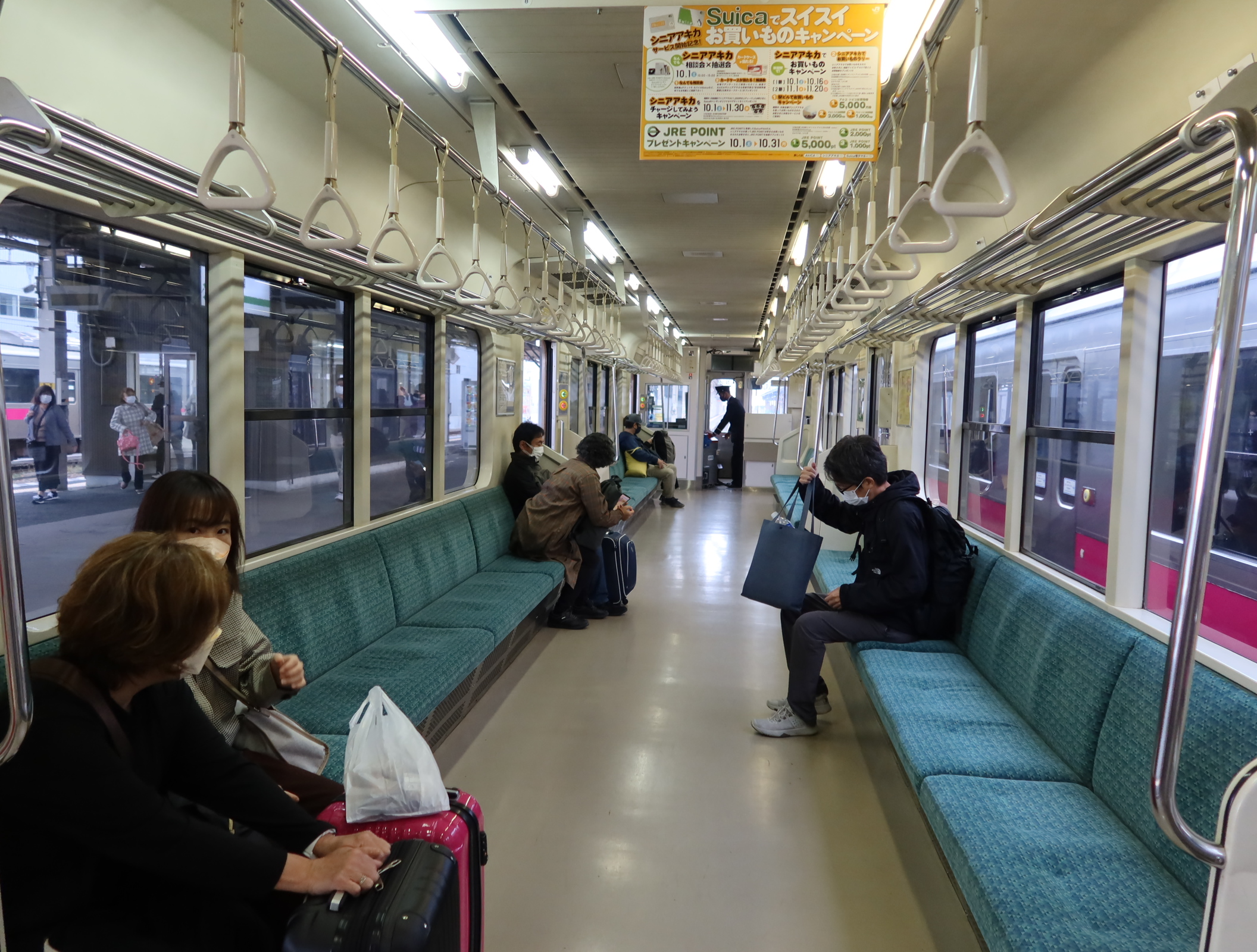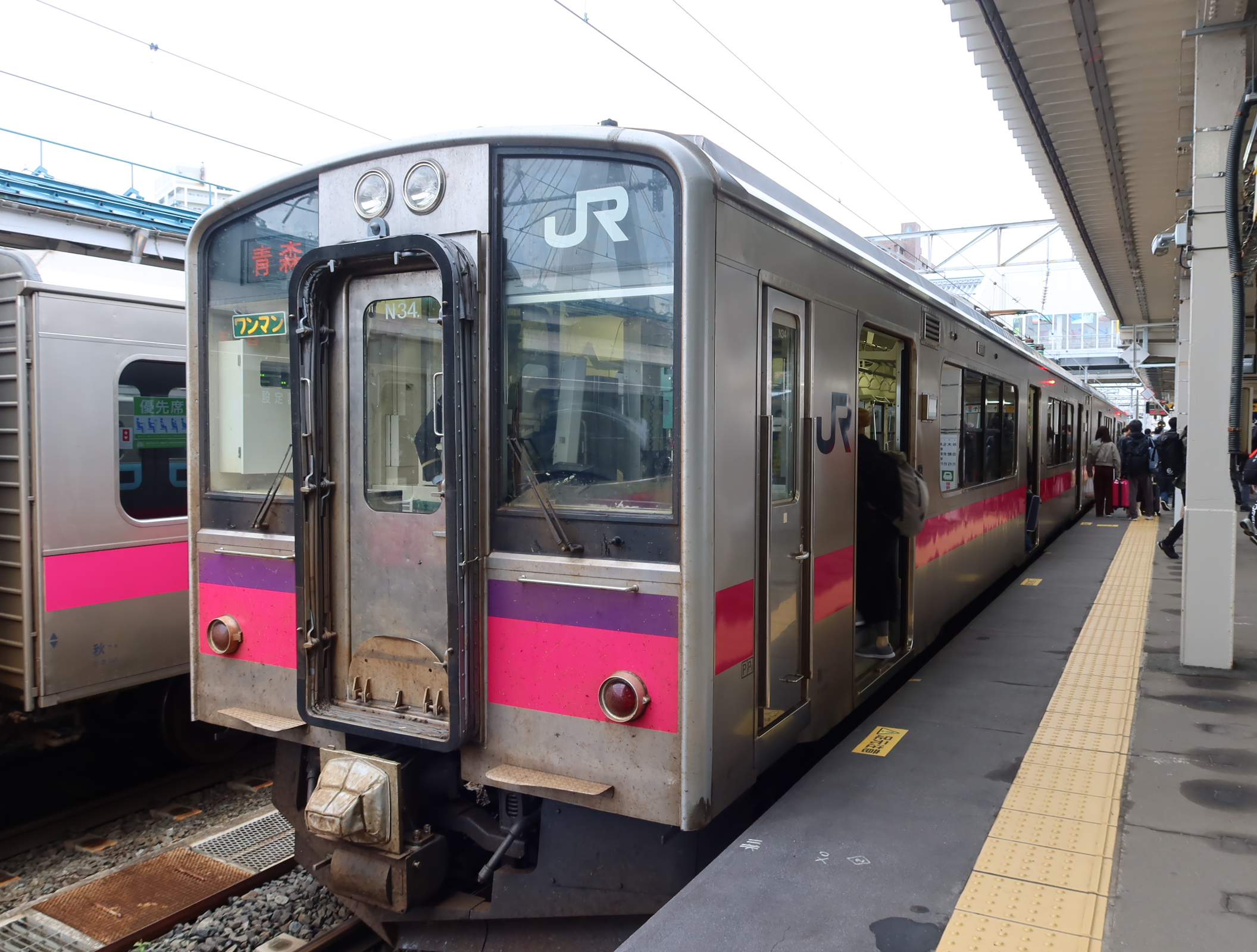 図1が東北新幹線の新青森駅における青森駅へ向かう電車である。図2が車内の様子である。図3が山形線での標準軌道の車両である。